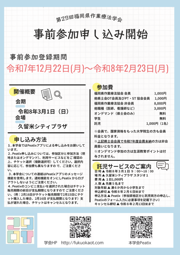 https://29fotgakkai.peatix.com/view - Peatix申込については、参加区分と参加方法(現地またはオンデマンド)、利用サービスなどをご確認の上、チケット選択(複数選択可)してください。選択内容に応じて、参加費も異なりますので、ご注意ください。